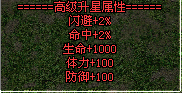 6、头盔、护腿、护甲、项链、副手属性:生命+1000,体力+100,防御+100,命中+2%,闪避+2%