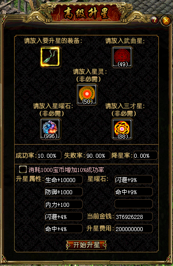 3、必需材料:高级武曲星、星曜石—命中、星曜石—闪避、星曜石—生命、星曜石—防御、星曜石—攻击、2亿金钱